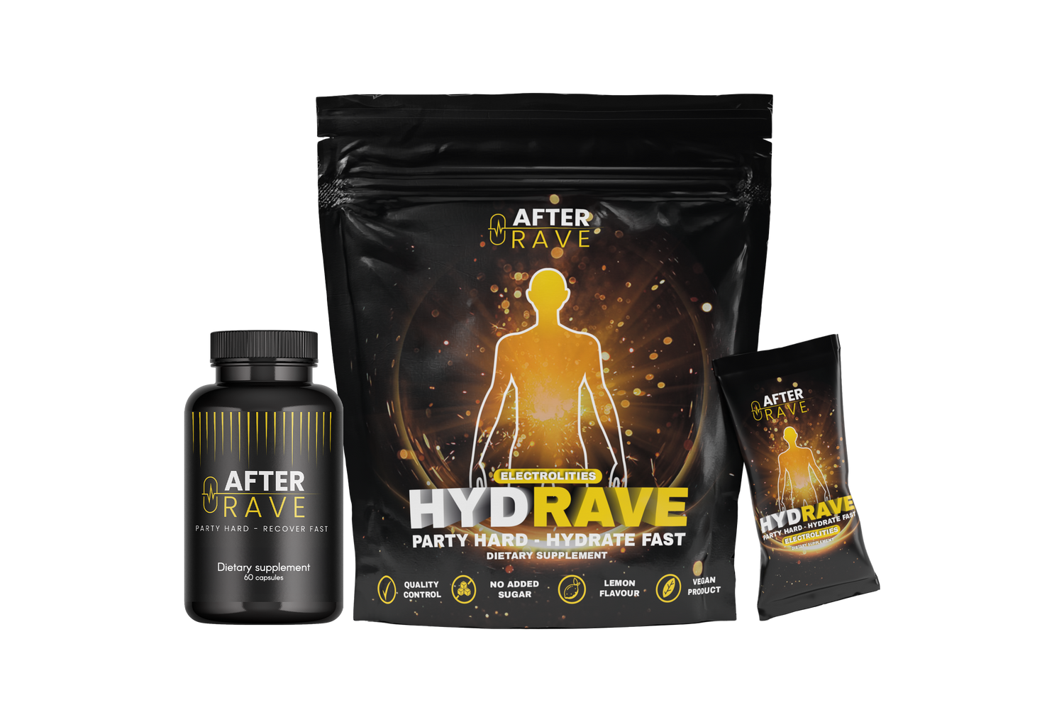 After-Rave and HydRAVE are indispensable products for everyone who loves to have fun but cares about their health. Our supplements are ideal for conscious party-goers who want to enjoy every moment without worrying about the negative effects of intense partying.Why After-Rave and HydRAVE?Health first - our products support your body's recovery, helping to minimise the negative health effects after an intense night out.Better wellbeing - thanks to carefully selected active ingredients, After-Rave and HydRAVE help to improve your mood and wellbeing, reducing feelings of fatigue and deprivation. Mental protection - we take care of your mental health by supporting the regenerative processes of the nervous system.Increased productivity - after a party with After-Rave and HydRAVE, you recover more quickly, allowing you to be more productive and efficient.Improved social relationships - by eliminating feelings of anxiety and deprivation, our supplements help you maintain healthy social relationships.